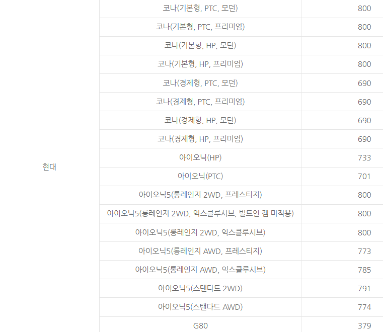 코나 모델은 690~800만 원, 아이오닉 모델은 733~800만 원, G80모델은 379만 원이 지원이 됩니다.