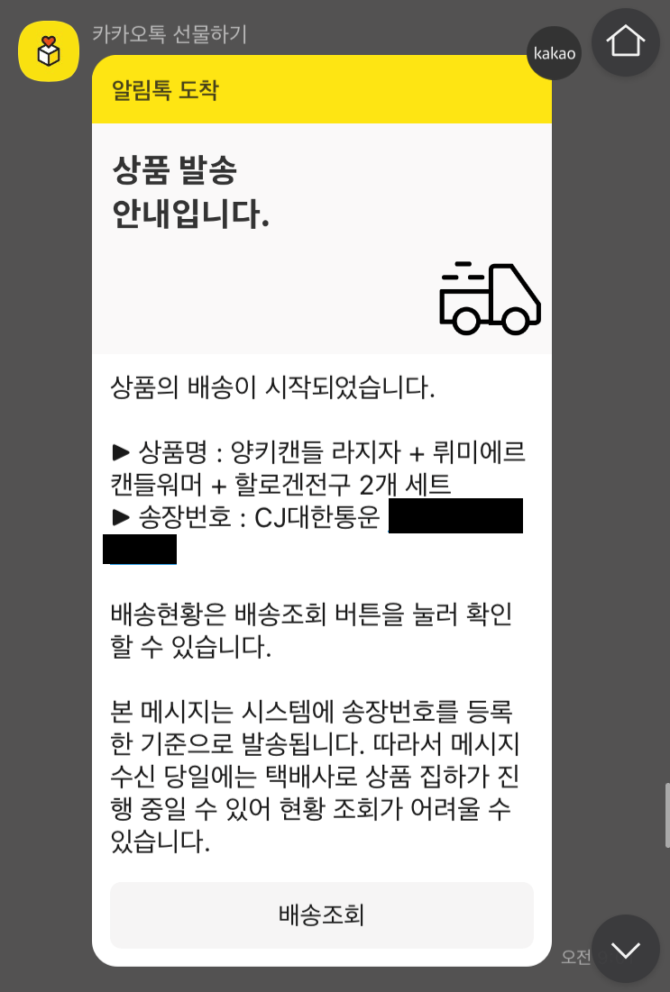 배송지를 입력 후 출고가 되면 카카오톡 선물하기를 통해 알림을 받을 수 있었습니다.
