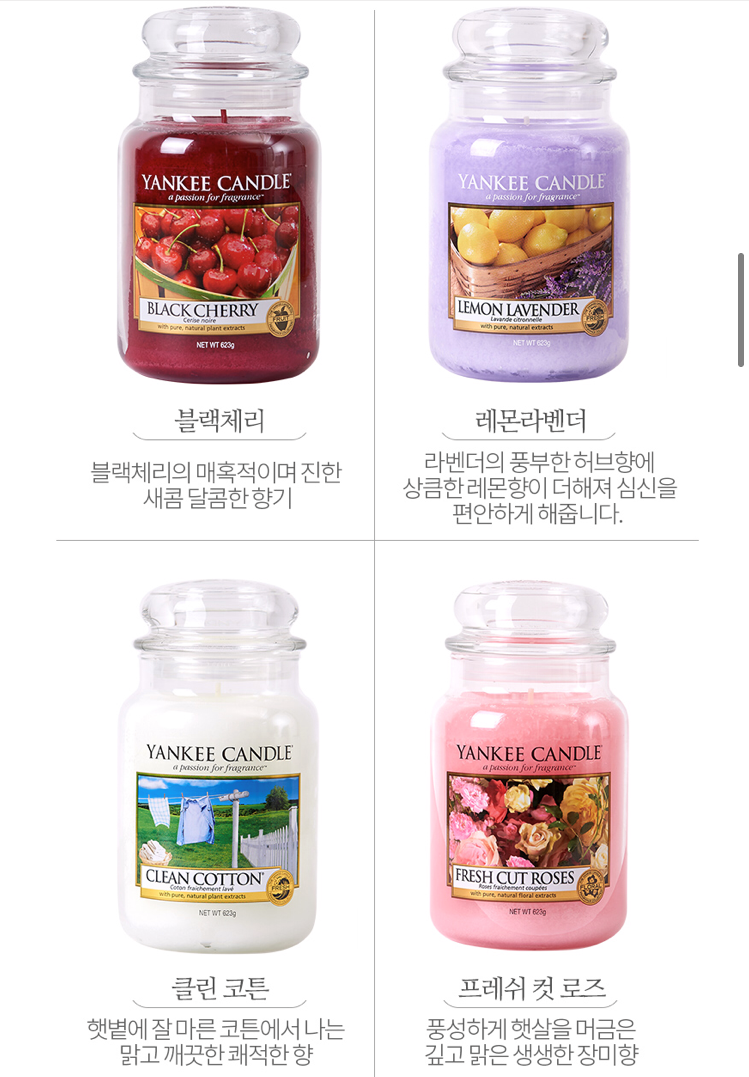 양키캔들의 향은 다음과 같이 총 6가지 향이 있었습니다.