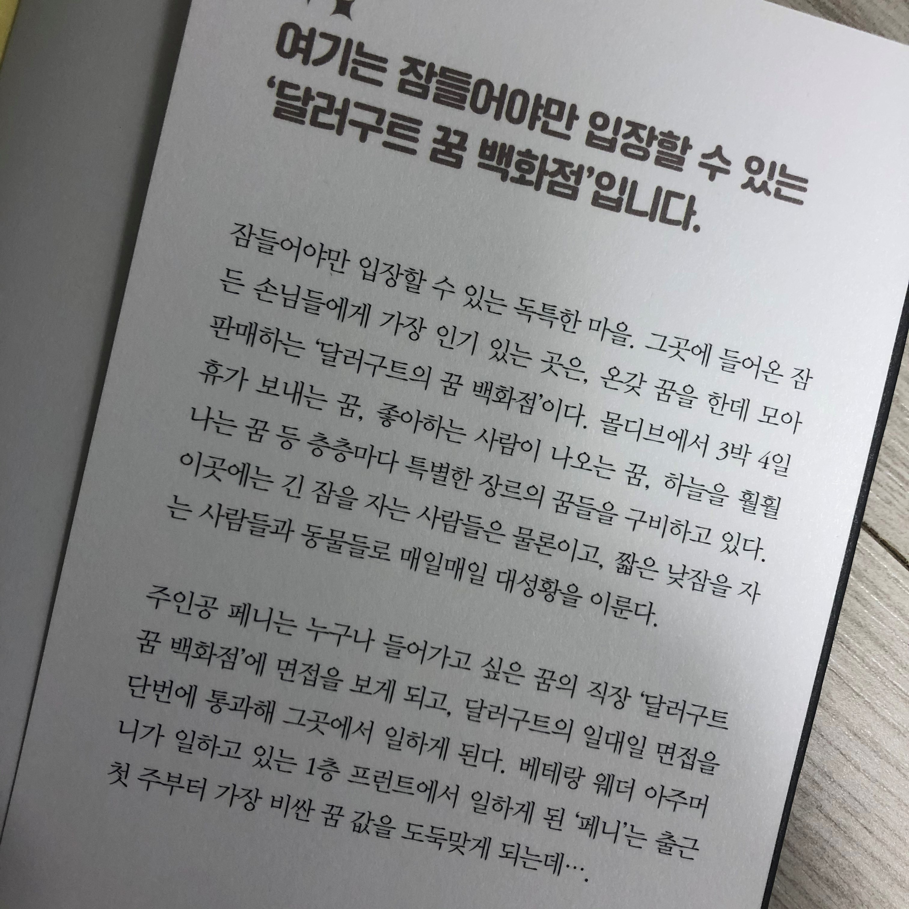 「잠들어야만 입장할 수 있는 독특한 마을, 그곳에 들어온 잠든 손님들에게 가장 인기 있는 곳은, 온갖 꿈을 한데 모아 판매하는 '달러구트의 꿈 백화점'이다. 몰디브에서 3박 4일 휴가 보내는 꿈, 좋아하는 사람이 나오는 꿈, 하늘을 훨훨 나는 꿈 등 층층마다 특별한 장르의 꿈들을 구비하고 있다. 이곳에는 긴 잠을 자는 사람들은 물론이고, 짧은 낮잠을 자는 사람들과 동물들로 매일매일 대성황을 이룬다. 주인공 페니는 누구나 들어가고 싶은 꿈의 직장 '달러구트 꿈 백화점'에 면접을 보게 되고, 달러구트의 일대일 면접을 단번에 통과해 그곳에서 일하게 된다. 베테랑 웨더 아주머니가 일하고 있는 1층 프런트에서 일하게 된 '페니'는 출근 첫 주부터 가장 비싼 꿈 값을 도둑맞게 되는데…」
